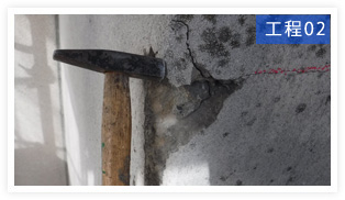 鉄筋の錆による膨張で、コンクリートが割れて壊れた状態です。ハンマー等で欠損個所を露わにします。