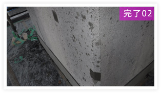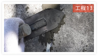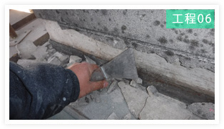 樹脂モルタルにて欠損個所を整形します。 硬化後にケレン清掃を行います。